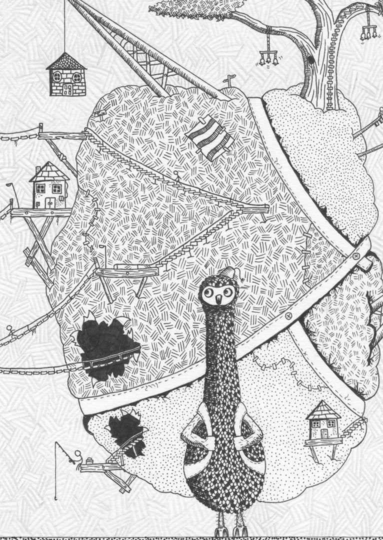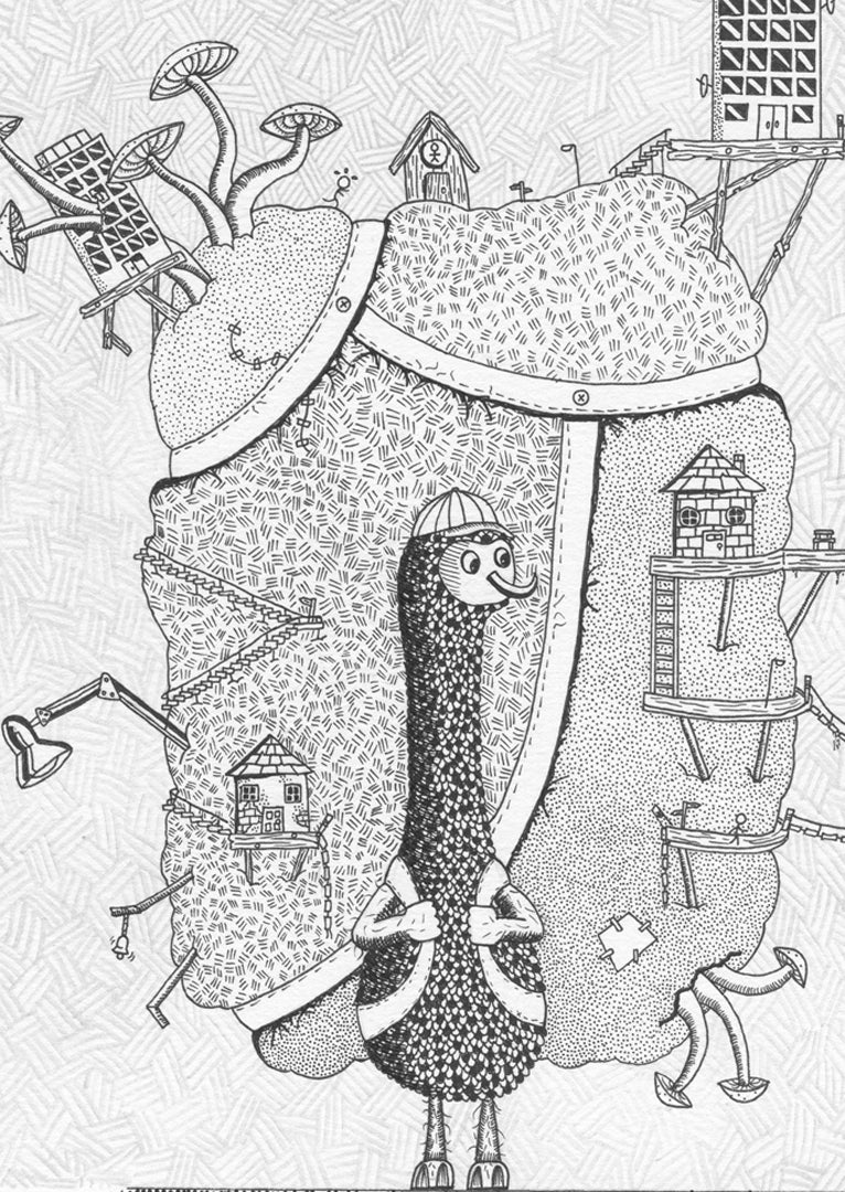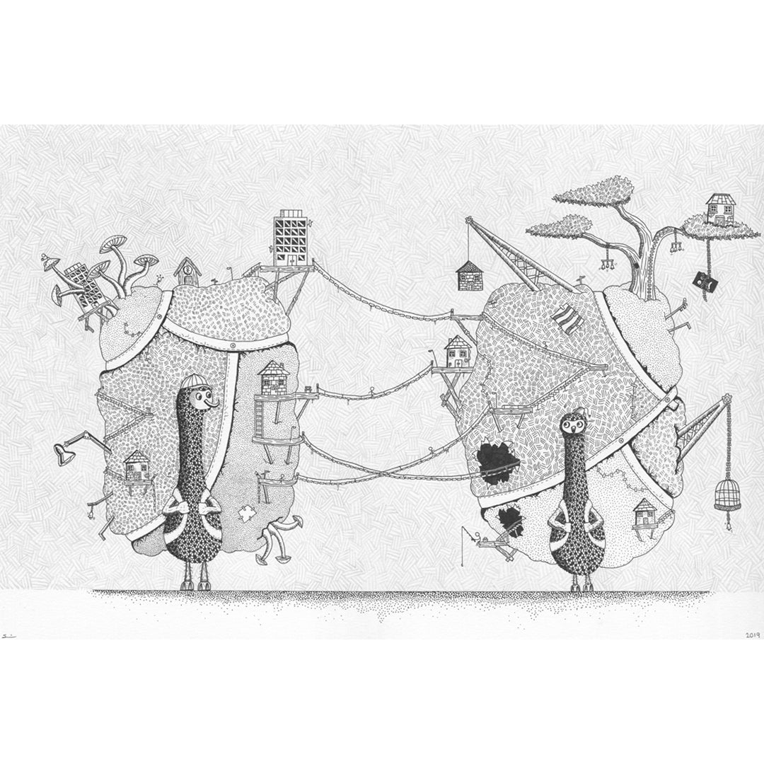 Fine detail original whimsical character drawing in ink and graphite created in Samuel's original and unique style.